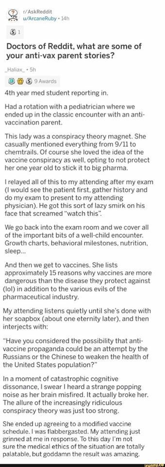In this piece a 4th year student talks about a patient who came in with some of the most popular conspiracy theories. She’s anti-vaccine, anti-pharma and she’s probably a flat-earther too. Instead of trying to convince her with logic or facts from the perspective a medical professional. The attending sold her on her own logic. Used what the patient needed to convince her.
